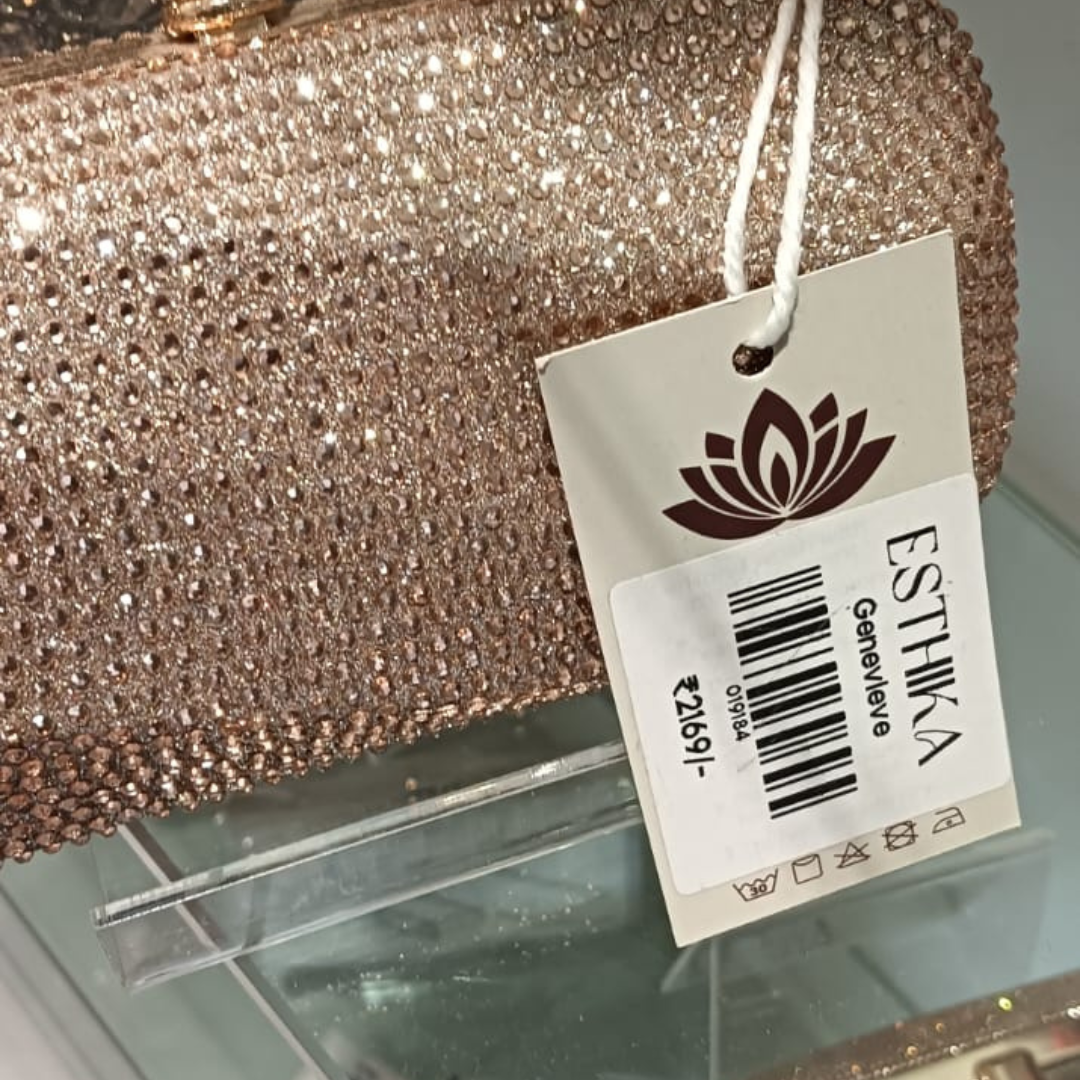 Elevate your style with this rose diamond-embellished clutch, featuring a sleek metal handle and chain for added elegance and versatility. Designed to complement Indian, Indo-Western, and Western outfits, this statement piece is perfect for parties, weddings, and festive occasions.